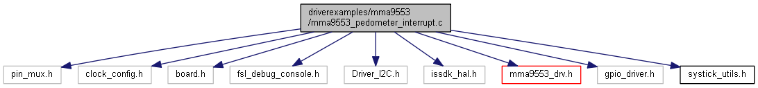 The mma9553_pedometer_interrupt.c file implements the ISSDK MMA9553L sensor driver example demonstration as a Pedometer in I2C Mode with Interrupts.
