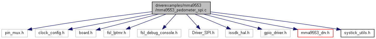 The mma9553_pedometer_spi.c file implements the ISSDK MMA9553L sensor driver example demonstration as a Pedometer in SPI Mode.
