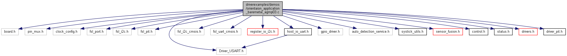 The orientaion_application_baremetal_agmp03.c file implements the ISSDK baremetal orientation application for FRDM-STBC-AGMP03 using sensor fusion core functional interfaces and host i/o interface. More...