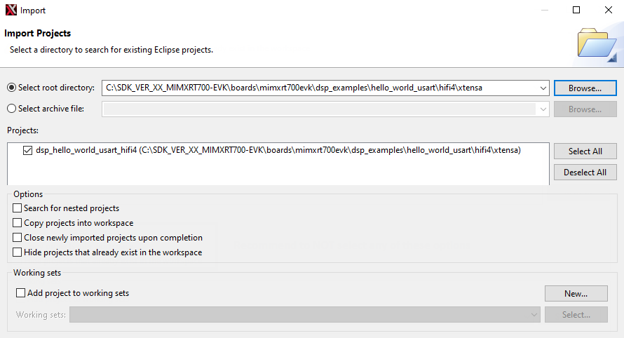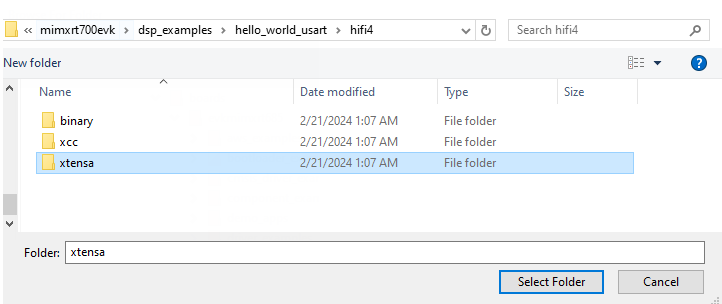 <SDK_ROOT>\boards\mimxrt700evk\dsp_examples\hello_world_usart\hifi4\xtensaas root directory.|