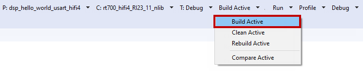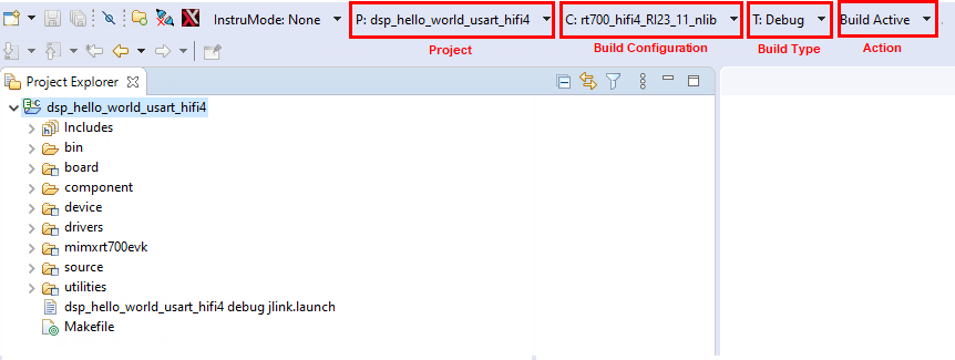 To make a build selection for the project and hardware target configuration, use the drop-down buttons on the menu bar.