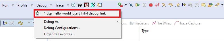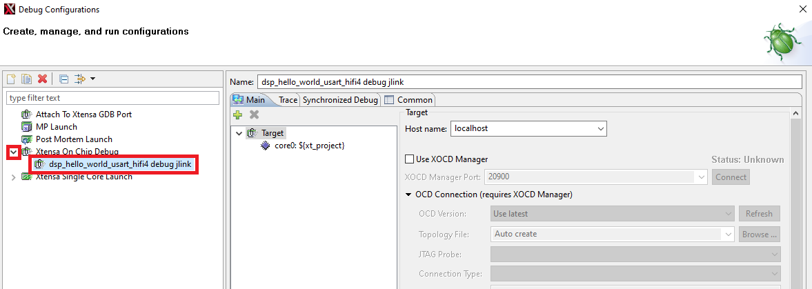 Expand the Xtensa On Chip Debug tree option and select ‘dsp_hello_world_hifi4_debug_jlink’.