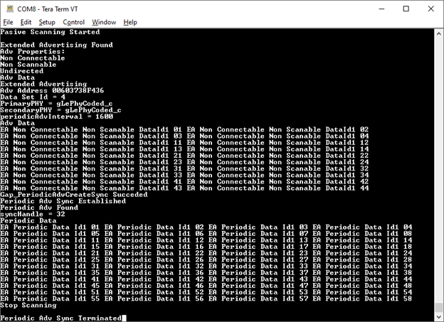 BLE Shell>gap extadvcfg -type 65 -phy1 3 BLE Shell>gap extadvdata 8 test_ext_adv_data BLE Shell>gap extadvstart --> GAP Event: Extended Advertising parameters successfully set. --> GAP Event: Extended Advertising data successfully set. --> GAP Event: Advertising state changed successfully!