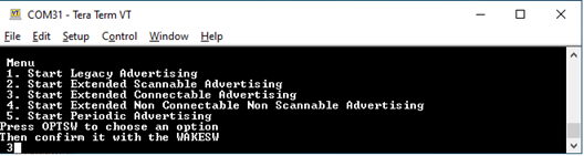 Press the ADVSW button to start advertising. This instruction is also displayed in the serial terminal as shown in the figure above.
