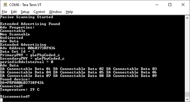 BLE Shell>gap address BLE Shell> --> GAP Event: Public Address Read:C4603770BCC5 BLE Shell>gap extadvcfg -phy1 3 BLE Shell>gap extadvstart BLE Shell> --> GAP Event: Extended Advertising parameters successfully set. BLE Shell> --> GAP Event: Extended Advertising data successfully set. BLE Shell> --> GAP Event: Advertising state changed successfully! BLE Shell>gap txpower adv 0 BLE Shell> --> GAP Event: Success!