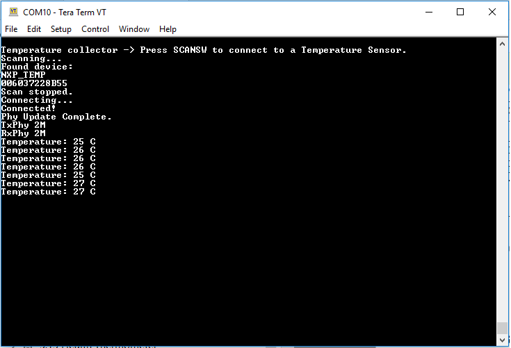 BLE Shell>gap scancfg -phy 4 BLE Shell>gap rssimonitor C4603770BCC5--> Reading RSSI on advertising channel: BLE Shell> -> GAP Event: Scan started. BLE Shell> RSSI: -27 dBm RSSI: -27 dBm RSSI: -27 dBm RSSI: -27 dBm RSSI: -27 dBm RSSI: -29 dBm