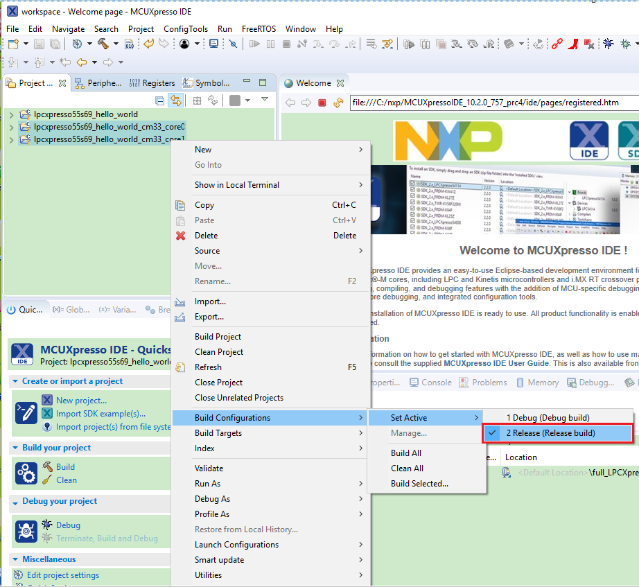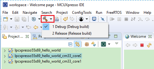 lpcxpresso55s69_hello_world_cm33_core0project (multicore master project) in the Project Explorer. Then choose the appropriate build target, Debug or Release, by clicking the downward facing arrow next to the hammer icon, as shown in Figure 3. For this example, select Debug.|