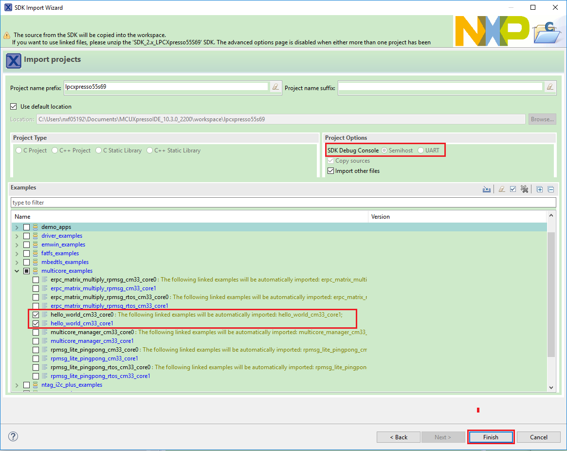 multicore_examplesfolder and select hello_world_cm33_core0. Thecore1counterpart project is automatically imported with thecore0project, because the multicore examples are linked together and there is no need to select it explicitly. Then select UART as SDK Debug Console. Click Finish.|