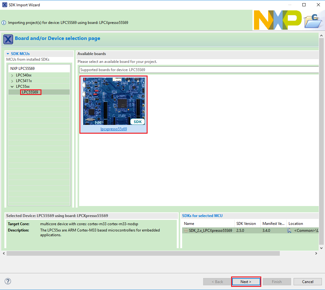 Multicore examples are imported into the workspace in a similar way as single core applications, explained in Build an example application. When the SDK zip package for LPCXpresso55S69 is installed and available in the Installed SDKs view, click Import SDK example(s)… on the Quickstart Panel. In the window that appears, expand the LPC55xx folder and select LPC55S69. Then, select lpcxpresso55s69 and click Next.