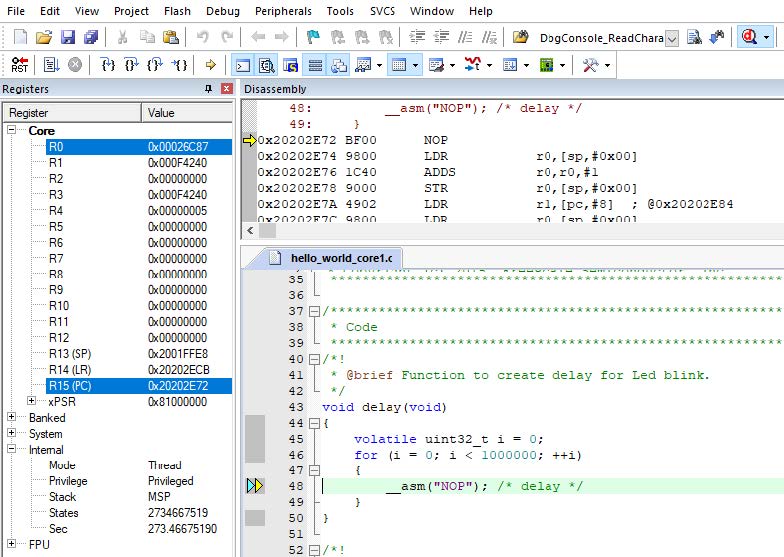 The primary core debugger flashes both the primary and the auxiliary core applications into the SoC flash memory. To download and run the multicore application, switch to the primary core application project and perform Steps 1 – 5 as described in Run an example application. These steps are common for both single-core and dual-core applications in μVision.