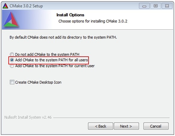 Install CMake, ensuring that the option Add CMake to the system PATH for all users is selected when installing. The user chooses to select whether it is installed into the PATH for all users or just the current user. In this example, it is installed for all users.