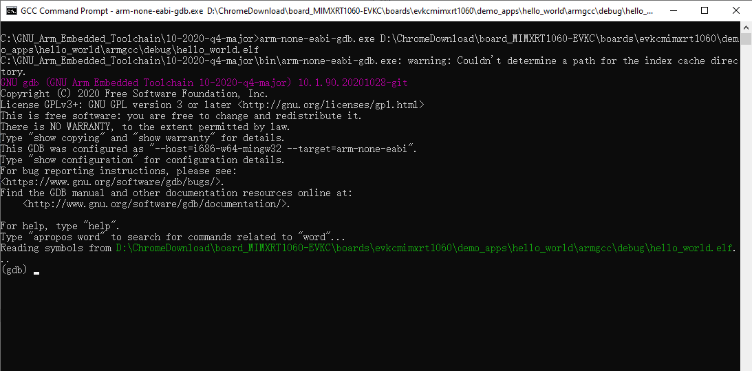 arm-none-eabi-gdb.exe <application_name>.elf. For this example, it isarm-none-eabi-gdb.exe hello_world.elf.