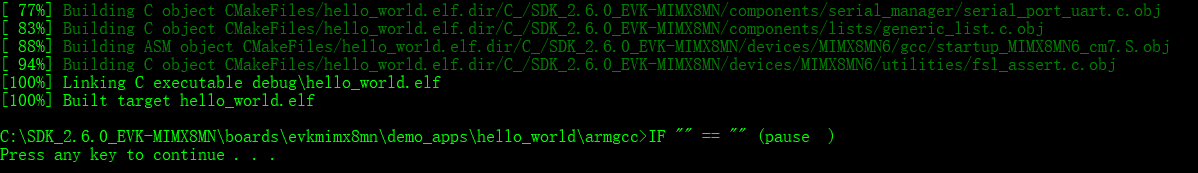 build_debug.shscript on the command line to perform the build. The output is shown as below:$ ./build_debug.sh -- TOOLCHAIN_DIR: /work/platforms/tmp/gcc-arm-none-eabi-8-2018-q4-major -- BUILD_TYPE: debug -- TOOLCHAIN_DIR: /work/platforms/tmp/gcc-arm-none-eabi-8-2018-q4-major -- BUILD_TYPE: debug -- The ASM compiler identification is GNU -- Found assembler: /work/platforms/tmp/gcc-arm-none-eabi-9-2019-q4-major/bin/arm-none-eabi-gcc -- Configuring done -- Generating done -- Build files have been written to: /work/platforms/tmp/nxp/SDK\_2.6.0\_EVK\_MIMX8MN/boards/evkmimx8mn/demo\_apps/hello\_world/armgcc Scanning dependencies of target hello_world.elf \[ 6%\] Building C object CMakeFiles/hello\_world.elf.dir/work/platforms/tmp/nxp/SDK\_2.6.0\_EVK\_MIMX8MN/boards/evkmimx8mn/demo\_apps/hello\_world/hello\_world.c.obj < -- skipping lines -- > [100%] Linking C executable debug/hello_world.elf [100%] Built target hello_world.elf