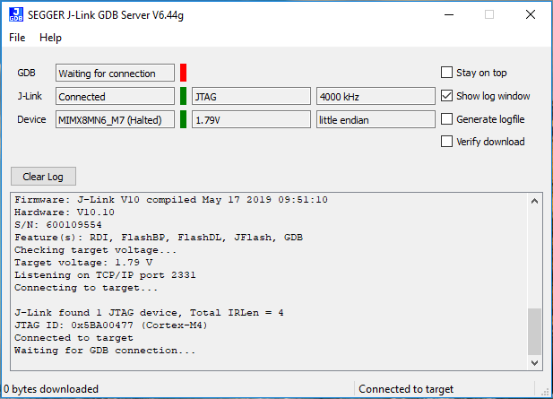 $ JLinkGDBServer -if JTAG -device SEGGER J-Link GDB Server Command Line Version JLinkARM.dll Command line: -if JTAG -device MIMX8MN6\_M7 -----GDB Server start settings----- GDBInit file: none GDB Server Listening port: 2331 SWO raw output listening port: 2332 Terminal I/O port: 2333 Accept remote connection: yes < -- Skipping lines -- > Target connection timeout: 0 ms ------J-Link related settings------ J-Link Host interface: USB J-Link script: none J-Link settings file: none ------Target related settings------ Target device: Target interface: JTAG Target interface speed: 1000 kHz Target endian: little Connecting to J-Link... J-Link is connected. Firmware: J-Link V10 compiled Feb 2 2018 18:12:40 Hardware: V10.10 S/N: 600109545 Feature(s): RDI, FlashBP, FlashDL, JFlash, GDB Checking target voltage... Target voltage: 1.82 V Listening on TCP/IP port 2331 Connecting to target... J-Link found 1 JTAG device, Total IRLen = 4 JTAG ID: 0x5BA00477 \(Cortex-M7\) Connected to target Waiting for GDB connection...