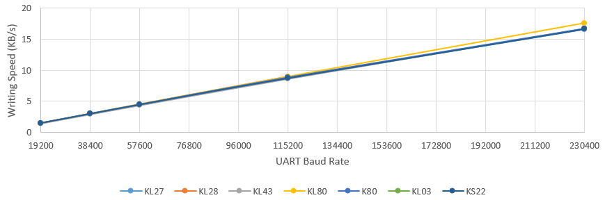 The table below provides reference to the expected performance of write speeds to Flash and RAM memories using the MCU bootloader SPI interface. The numbers have been measured on a number of platforms running the MCU bootloader either from ROM or the RAM (in case of flashloaders).