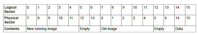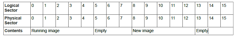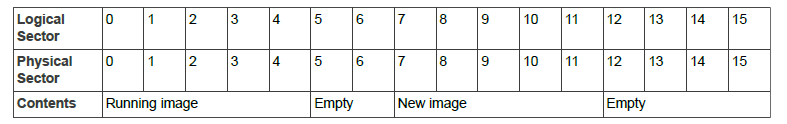 If we now download a further new image that is 161KB (6 sectors) in size, it would replace the old running image and be placed into logical sectors 8 to 13, which are physical sectors 0, 1, 2, 3, 4 and 13. However, this new image is then unusable because the physical sectors are not contiguous and the bootloader does not take this into account when it remaps the memory (if the new image was less than 160KB, there would be no problem).