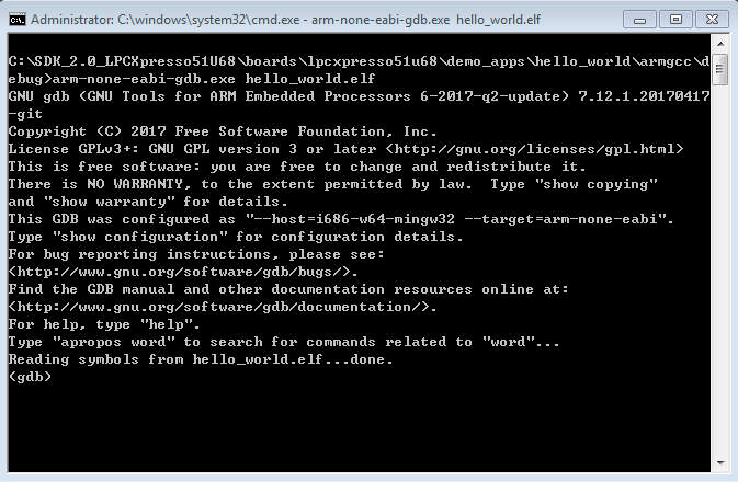 Run the command “arm-none-eabi-gdb.exe <application_name>.elf”. For this example, it is “arm-none-eabi-gdb.exe hello_world.elf”.