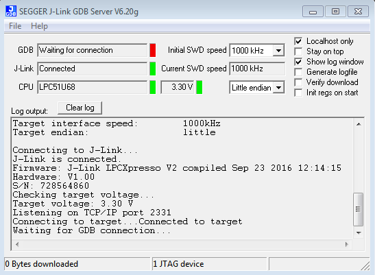 Open the J-Link GDB Server application. Assuming the J-Link software is installed, the application can be launched by going to the Windows operating system Start menu and selecting “Programs -> SEGGER -> J-Link <version> J-Link GDB Server”.