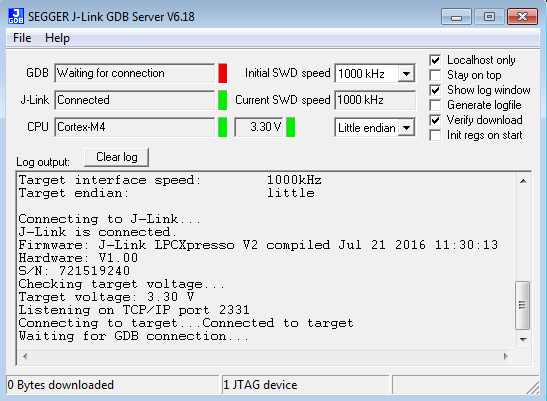 Open the J-Link GDB Server application. Assuming the J-Link software is installed, the application can be launched by going to the Windows operating system Start menu and selecting “Programs -> SEGGER -> J-Link <version> J-Link GDB Server”.