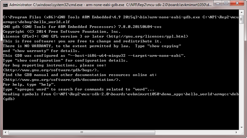 arm-none-eabi-gdb.exe <application_name>.elf. For this example, it isarm-none-eabi-gdb.exe hello_world.elf.
