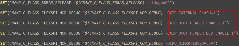 flexspi_nortargets to support XIP, as described in Table 1.|XIP_EXTERNAL_FLASH|1: Exclude the code which changes the clock of FLEXSPI.| |0: Make no changes.| |XIP_BOOT_HEADER_ENABLE|1: Add FLEXSPI configuration block, image vector table, boot data, and device configuration data (optional) to the image by default.| |0: Add nothing to the image by default.| |XIP_BOOT_HEADER_DCD_ENABLE|1: Add device configuration data to the image.| |0: Do NOT add device configuration data to the image.|