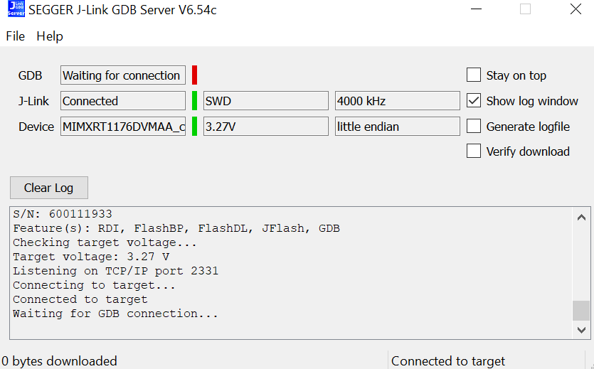 Open the J-Link GDB Server application. Go to the SEGGER install folder. For example, C:\Program Files(x86)\SEGGER\JLink_Vxxx. Open the command windows. For Debug and Release targets, use the