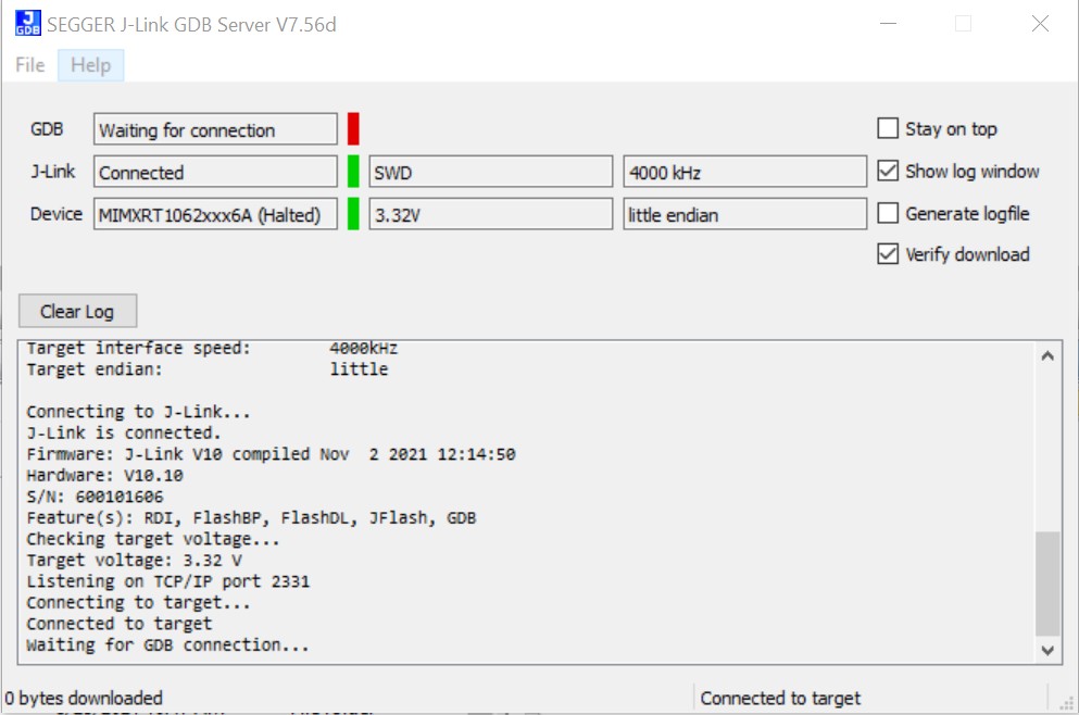 Open the J-Link GDB Server application. Go to the SEGGER install folder. For example, C:\Program Files(x86)\SEGGER\JLink_Vxxx. Open the command windows. For Debug and Release targets, use the