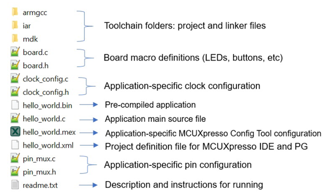 All files in the application folder are specific to that example, so it is easy to copy and paste an existing example to start developing a custom application based on a project provided in the MCUXpresso SDK.