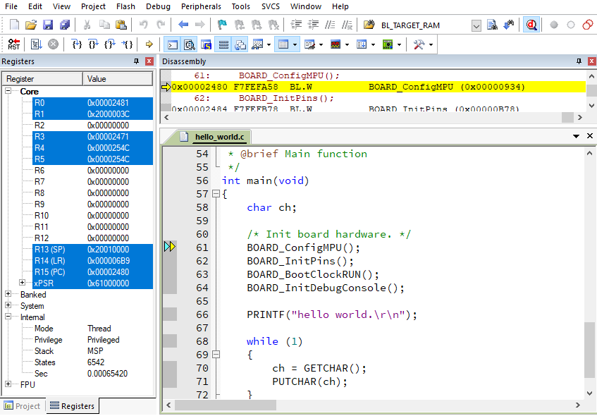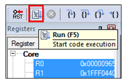 To debug the application, click load (or press the F8 key). Then, click the Start/Stop Debug Session button, highlighted in red in Figure 2. If using J-Link as the debugger, click Project option >Debug >Settings >Debug >Port, and select SW.