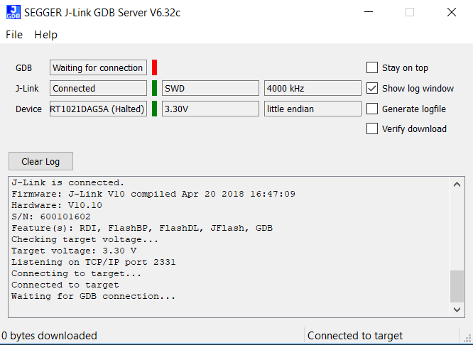 Open the J-Link GDB Server application. Go to the SEGGER install folder. For example, C:\Program Files(x86)\SEGGER\JLink_Vxxx. Open the command windows. For Debug and Release targets, use the