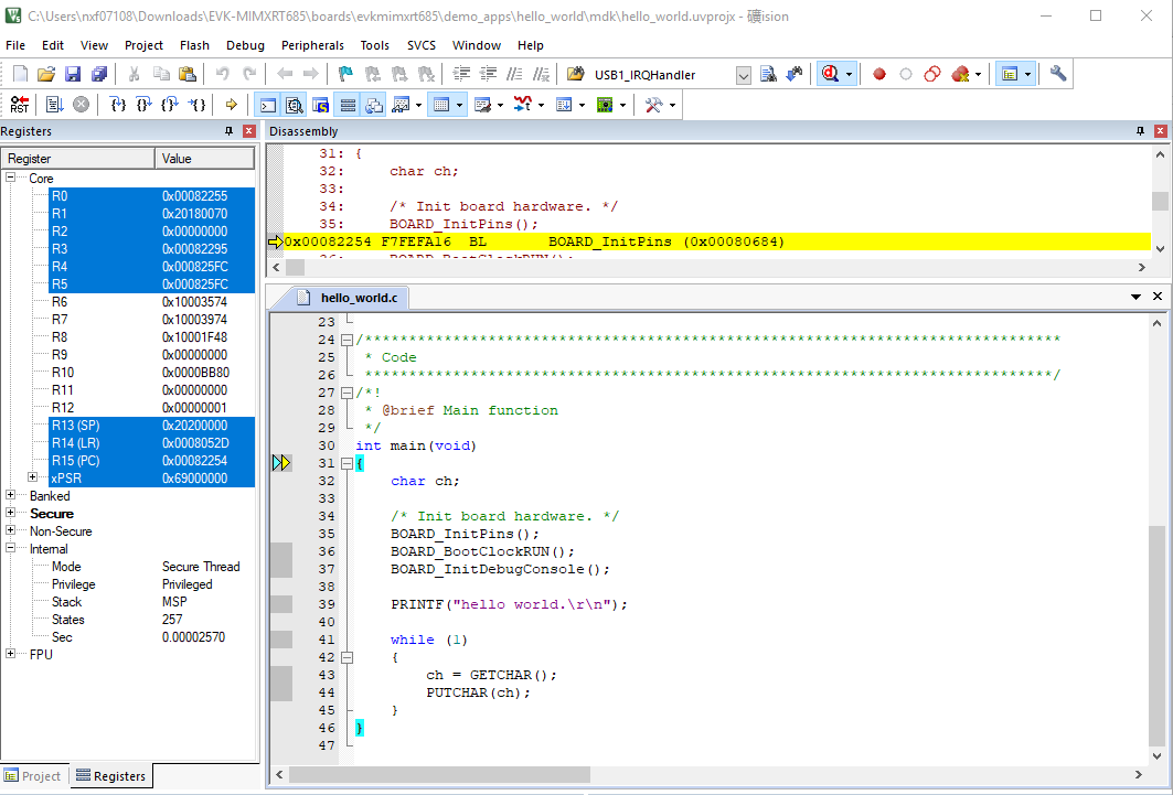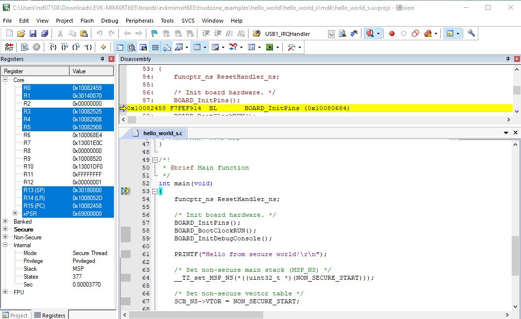 To download and run the TrustZone application, switch to the secure application project and perform steps as described in Run a TrustZone example application. These steps are common for single core, dual-core, and TrustZone applications in μVision. After clicking Download and Debug, both the secure and non-secure images are loaded into the device flash memory, and the secure application is executed. It stops at the main() function.