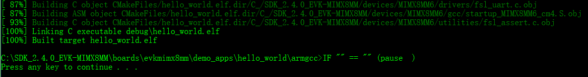 build_debug.shscript on the command line to perform the build. The output is shown as below:$ ./build_debug.sh -- TOOLCHAIN_DIR: /work/platforms/tmp/gcc-arm-none-eabi-<version\> -- BUILD_TYPE: debug -- TOOLCHAIN_DIR: /work/platforms/tmp/gcc-arm-none-eabi-<version\> -- BUILD_TYPE: debug -- The ASM compiler identification is GNU -- Found assembler: /work/platforms/tmp/gcc-arm-none-eabi-<version\>/bin/arm-none-eabi-gcc -- Configuring done -- Generating done -- Build files have been written to: /work/platforms/tmp/nxp/SDK\_2.x.x\_EVK-MIMX8MM/boards/evkmimx8mm/demo\_apps/hello\_world/armgcc Scanning dependencies of target hello_world.elf \[ 6%\] Building C object CMakeFiles/hello\_world.elf.dir/work/platforms/tmp/nxp/SDK\_2.x.x\_EVK-MIMX8MM/boards/evkmimx8mm/demo\_apps/hello\_world/hello\_world.c.obj < -- skipping lines -- > [100%] Linking C executable debug/hello_world.elf [100%] Built target hello_world.elf