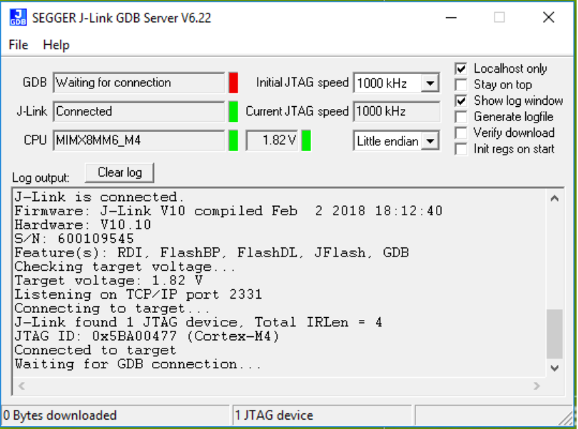$ JLinkGDBServer -if JTAG -device SEGGER J-Link GDB Server Command Line Version JLinkARM.dll Command line: -if JTAG -device MIMX8MM6\_M4 -----GDB Server start settings----- GDBInit file: none GDB Server Listening port: 2331 SWO raw output listening port: 2332 Terminal I/O port: 2333 Accept remote connection: yes < -- Skipping lines -- > Target connection timeout: 0 ms ------J-Link related settings------ J-Link Host interface: USB J-Link script: none J-Link settings file: none ------Target related settings------ Target device: Target interface: JTAG Target interface speed: 1000 kHz Target endian: little Connecting to J-Link... J-Link is connected. Firmware: J-Link V10 compiled Feb 2 2018 18:12:40 Hardware: V10.10 S/N: 600109545 Feature(s): RDI, FlashBP, FlashDL, JFlash, GDB Checking target voltage... Target voltage: 1.82 V Listening on TCP/IP port 2331 Connecting to target... J-Link found 1 JTAG device, Total IRLen = 4 JTAG ID: 0x5BA00477 \(Cortex-M4\) Connected to target Waiting for GDB connection...
