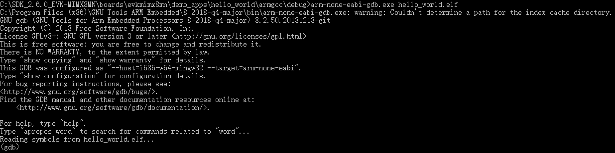 $ arm-none-eabi-gdb hello_world.elf GNU gdb (GNU Tools for Arm Embedded Processors 8-2018-q4-major) 8.2.50.20181213-git Copyright (C) 2018 Free Software Foundation, Inc. License GPLv3+: GNU GPL version 3 or later <http://gnu.org/licenses/gpl.html> This is free software: you are free to change and redistribute it. There is NO WARRANTY, to the extent permitted by law. Type "show copying" and "show warranty" for details. This GDB was configured as "--host=i686-w64-mingw32 --target=arm-none-eabi". Type "show configuration" for configuration details. For bug reporting instructions, please see: <http://www.gnu.org/software/gdb/bugs/>. Find the GDB manual and other documentation resources online at: <http://www.gnu.org/software/gdb/documentation/>. For help, type "help". Type "apropos word" to search for commands related to "word"... Reading symbols from hello_world.elf... (gdb)