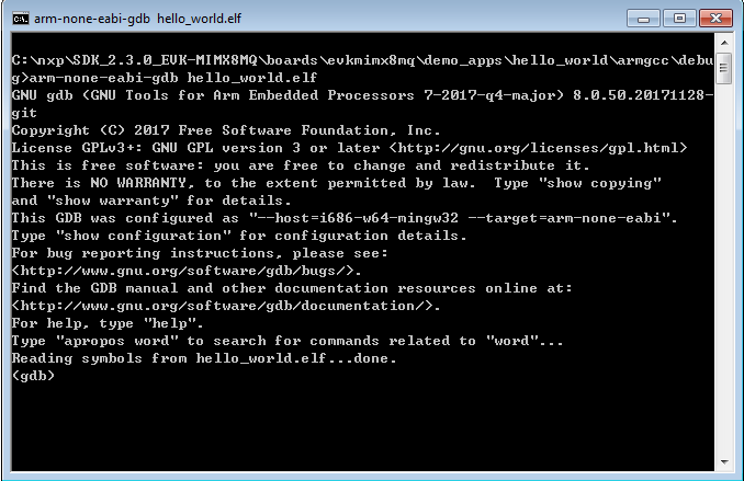 $ arm-none-eabi-gdb hello_world.elf GNU gdb (GNU Tools for Arm Embedded Processors 7-2017-q4-major) 8.0.50.20171128-git Copyright (C) 2017 Free Software Foundation, Inc. License GPLv3+: GNU GPL version 3 or later <http://gnu.org/licenses/gpl.html> This is free software: you are free to change and redistribute it. There is NO WARRANTY, to the extent permitted by law. Type "show copying" and "show warranty" for details. This GDB was configured as "--host=x86_64-linux-gnu --target=arm-none-eabi". Type "show configuration" for configuration details. For bug reporting instructions, please see: <http://www.gnu.org/software/gdb/bugs/>. Find the GDB manual and other documentation resources online at: <http://www.gnu.org/software/gdb/documentation/>. For help, type "help". Type "apropos word" to search for commands related to "word"... Reading symbols from hello_world.elf... (gdb)