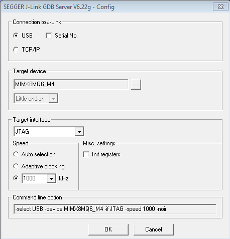 $ JLinkGDBServer -if JTAG -device MIMX8MQ6\_M4 SEGGER J-Link GDB Server V6.22a Command Line Version JLinkARM.dll V6.22g \(DLL compiled Jan 17 2018 16:40:32\) Command line: -if JTAG -device MIMX8MQ6\_M4 -----GDB Server start settings----- GDBInit file: none GDB Server Listening port: 2331 SWO raw output listening port: 2332 Terminal I/O port: 2333 Accept remote connection: yes < -- Skipping lines -- > Target connection timeout: 0 ms ------J-Link related settings------ J-Link Host interface: USB J-Link script: none J-Link settings file: none ------Target related settings------ Target device: MIMX8MQ6\_M4 Target interface: JTAG Target interface speed: 1000 kHz Target endian: little Connecting to J-Link... J-Link is connected. Firmware: J-Link V10 compiled Jan 11 2018 10:41:05 Hardware: V10.10 S/N: 600101610 Feature(s): RDI, FlashBP, FlashDL, JFlash, GDB Checking target voltage... Target voltage: 3.39 V Listening on TCP/IP port 2331 Connecting to target... J-Link found 1 JTAG device, Total IRLen = 4 JTAG ID: 0x5BA00477 \(Cortex-M4\) Connected to target Waiting for GDB connection...