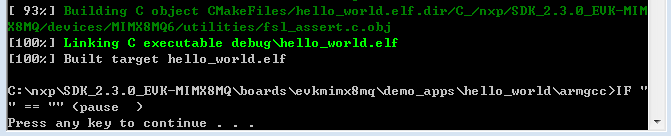 build_debug.shscript on the command line to perform the build. The output is shown as below:$ ./build_debug.sh -- TOOLCHAIN_DIR: /work/platforms/tmp/gcc-arm-none-eabi-7-2017-q4-major -- BUILD_TYPE: debug -- TOOLCHAIN_DIR: /work/platforms/tmp/gcc-arm-none-eabi-7-2017-q4-major -- BUILD_TYPE: debug -- The ASM compiler identification is GNU -- Found assembler: /work/platforms/tmp/gcc-arm-none-eabi-7-2017-q4-major/bin/arm-none-eabi-gcc -- Configuring done -- Generating done -- Build files have been written to: /work/platforms/tmp/nxp/SDK\_2.3.0\_EVK-MIMX8MQ/boards/evkmimx8mq/demo\_apps/hello\_world/armgcc Scanning dependencies of target hello_world.elf \[ 6%\] Building C object CMakeFiles/hello\_world.elf.dir/work/platforms/tmp/nxp/SDK\_2.3.0\_EVK-MIMX8MQ/boards/evkmimx8mq/demo\_apps/hello\_world/hello\_world.c.obj < -- skipping lines -- > [100%] Linking C executable debug/hello_world.elf [100%] Built target hello_world.elf