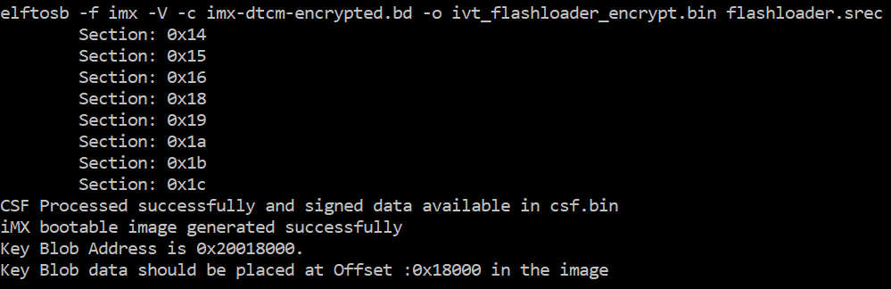 The second one is ivt_flashloader_encrypt_nopadding.bin, which starts from ivt_offset directly. The CSF section is generated and appended to the unsigned bootable image successfully.