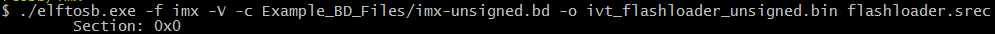 The elftosb utility supports two types of BD files. The first type of file is used for the i.MX RT bootable image generation. The “-f imx” option is mandatory during boot image generation using the elftosb utility. The second type of file contains commands that are used for memory programming. The “-f kinetis” flag is mandatory in this use case.