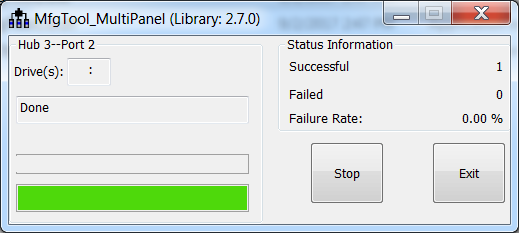 In production phase, the device can be in HAB closed mode for most use cases. Users can configure the “name” field in cfg.ini file as <Device>-SecureBoot, then prepare the boot_image.sb file, enable_hab.sb and ivt_flashloader_signed.bin using the elftosb utility. After all are generated, place them into “<Device>/OS Firmware/” folder, then put device in serial downloader, connect it to host PC. Open MfgTool2.exe and click “Start” to trigger a programming sequence. After the programming completes, the window below will be seen. To exit MfgTool, click “Stop” and then “Exit”.