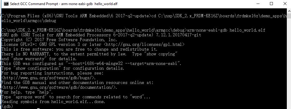 7. Run the arm-none-eabi-gdb.exe <application_name>.elf command. For this example, it is arm-none-eabi-gdb.exe hello_world.elf.