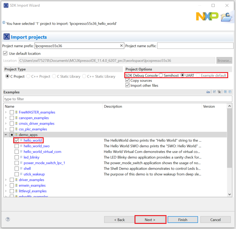trustzone_examples/folder and selecthello_world_s. Because TrustZone examples are linked together, the non-secure project is automatically imported with the secure project, and there is no need to select it explicitly. Then select UART as SDK Debug Console. Then, click Finish.|