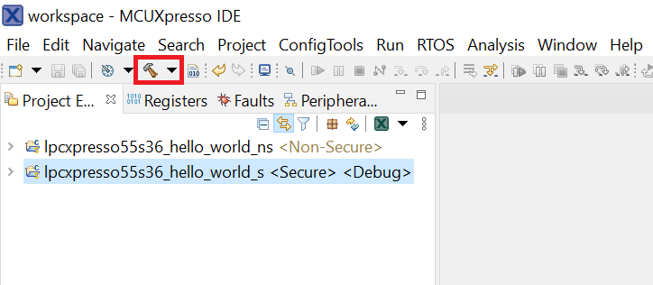 lpcxpresso55s36\_hello\_world\_sproject (TrustZone master project) in the Project Explorer. Then, choose the appropriate build target, Debug or Release, by clicking the downward facing arrow next to the hammer icon, as shown in Figure 3. For this example, select the Debug target.|