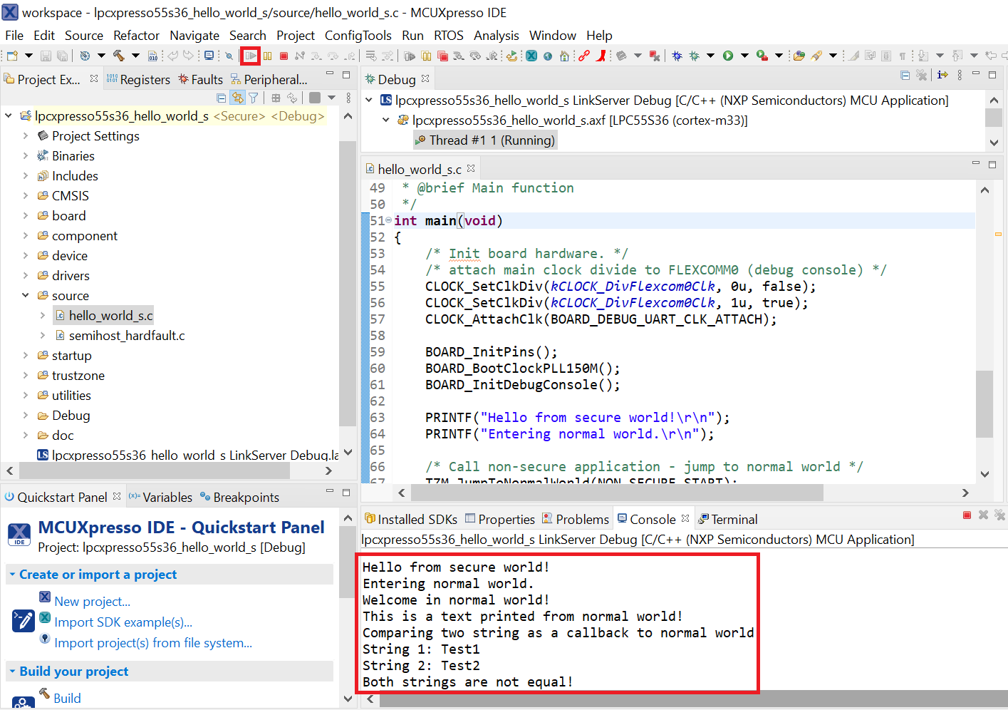 After loading the non-secure application, press RESET on board to release the device connect. Then, highlight the lpcxpresso55s36_trustzone_examples_hello_world_s project (TrustZone master project) in the Project Explorer. In the Quickstart Panel, click lpcxpresso55s36_trustzone_examples_hello_world_s [Debug] to launch the second debug session.