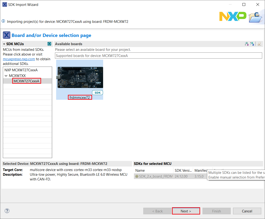 3. In the window that appears, expand the MCXW7XX folder and select MCXW726CxxxA. Then, select frdmmcxw72 and click Next.
