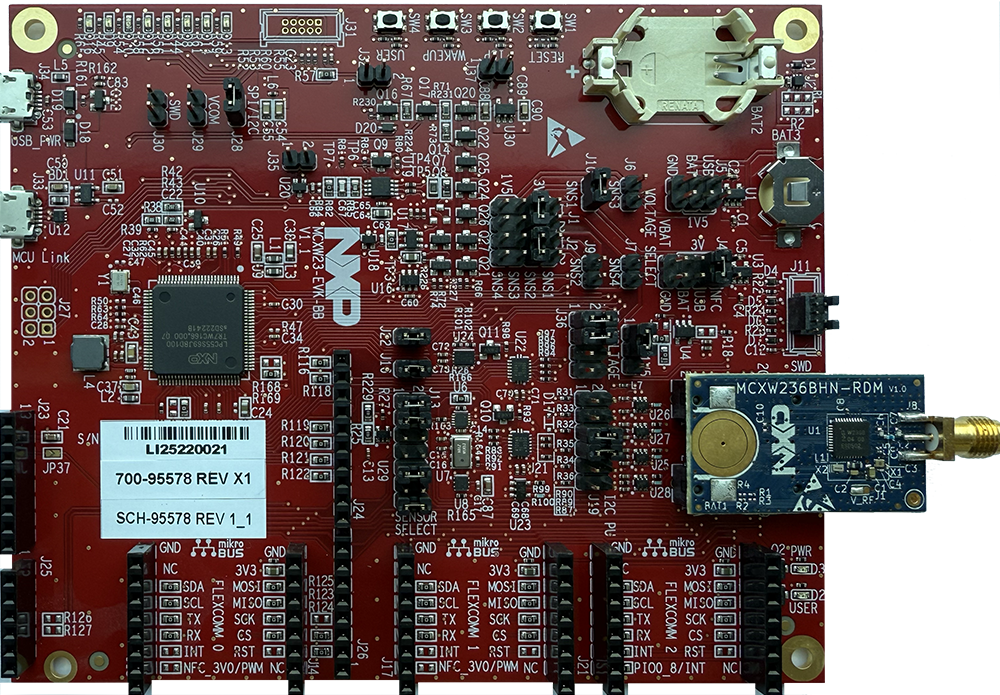 The NXP MCXW23-EVK is a development board for the MCXW23 32 MHz Arm Cortex-M33 microcontroller.