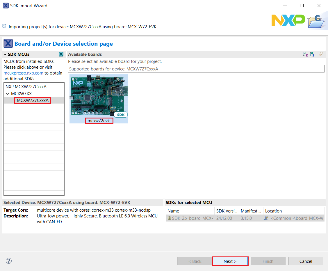 In the window that appears, expand the mcx folder and select MCXW72. Then, select mcxw72evk and click Next.