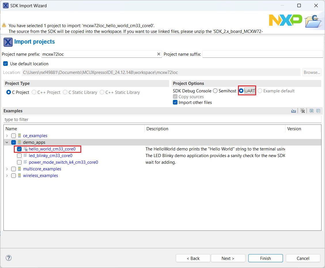 This section describes the steps required to configure MCUXpresso IDE to build, run, and debug example applications. The hello_world demo application targeted for the MCXW72-LOC hardware platform is used as an example, though these steps can be applied to any example application in the MCUXpresso SDK.