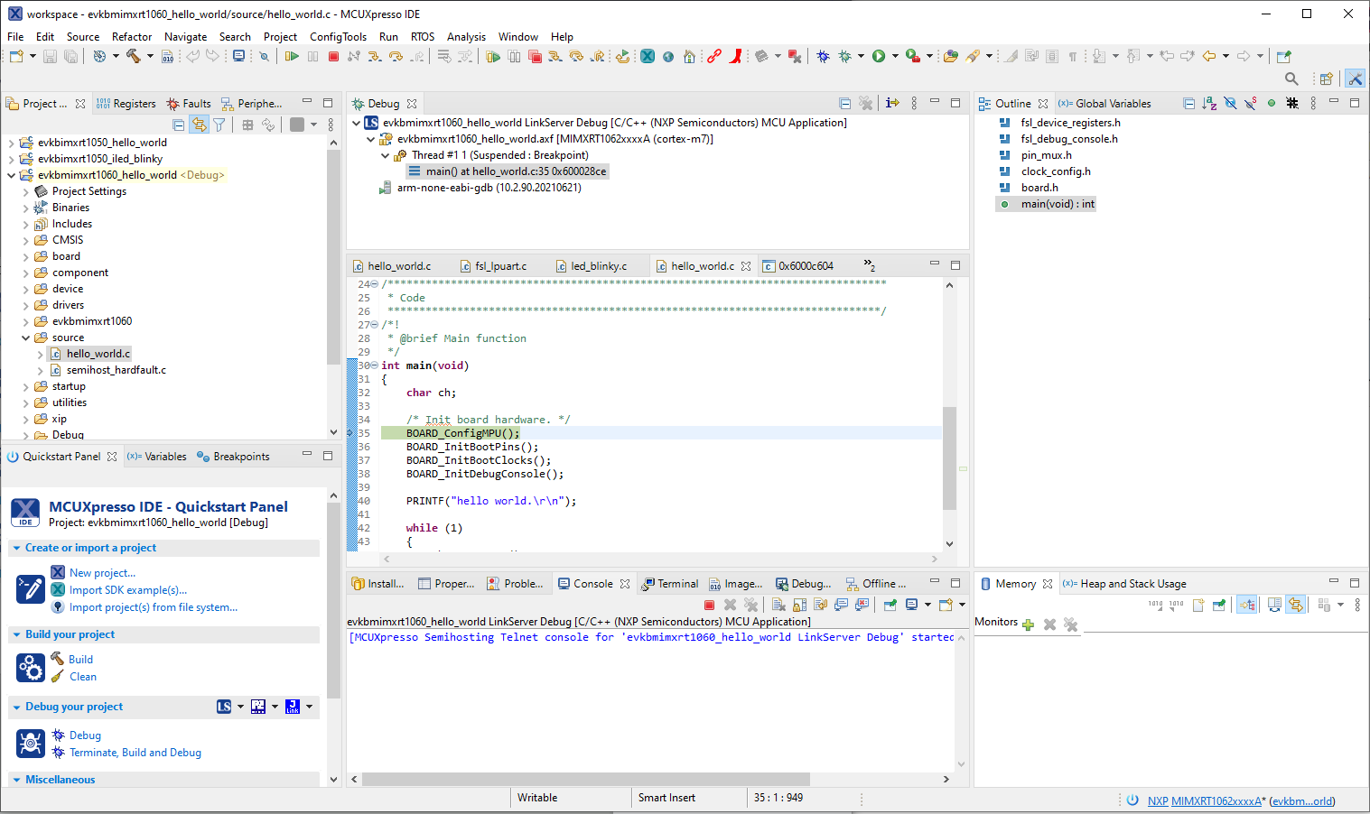 On the Quickstart Panel, click Debug evkbmimxrt1060_demo_apps_hello_world [Debug].