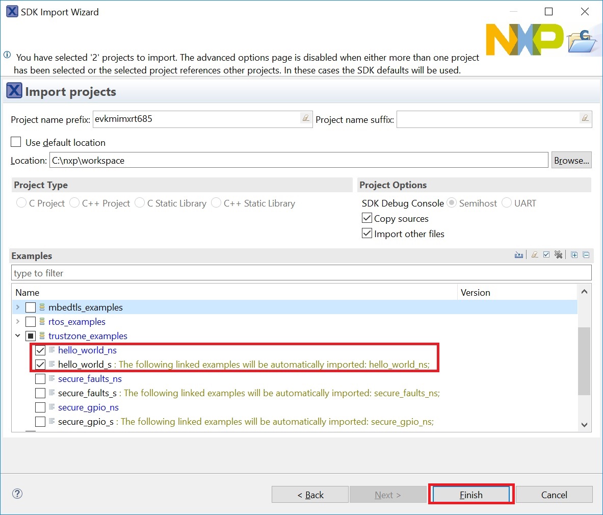 trustzone_examples/folder and selecthello_world_s. Because TrustZone examples are linked together, the non-secure project is automatically imported with the secure project, and there is no need to select it explicitly. Then, click Finish.|